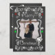 Un fondo de pizarra con hermosos rollos, estrellas y adornos de texto blanco, rojo, verde y blanco que dice "Feliz Navidad" delante y "Que todos tus días sean alegres y brillantes" detrás. Esta hermosa tarjeta personalizada de fotos navideñas de vacaciones tiene varios adornos estelares, y un pájaro en un diseño de nido y áreas que puedes fácilmente agregar tus nombres, el año actual, y foto!