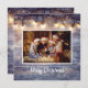 Tarjeta navideña de fotos de madera rústica de tipo String Light. Envíe sus saludos de la temporada con este fondo rústico de madera y luces de cuerda sobre la foto de la familia. Front tiene área para el texto, back tiene áreas para saludar y nombres de familia.