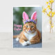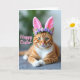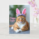 Esta tarjeta muestra un atigrado ginger relajado con franjas ámbar y pecho y patas blancas, acostado con las patas delanteras suavemente cruzadas como si posara para un dulce retrato primaveral. Unas suaves orejas de conejo rosadas se sientan en su cabeza, y una pequeña corona de diminutas flores de lavanda añade un toque tierno y amistoso 🐰. Los ojos verdes del gato miran hacia adelante con un enfoque tranquilo y afectuoso, como si compartiera un momento tranquilo con alguien cercano. La luz cae suavemente sobre el pelaje, resaltando la textura suave y los finos bigotes blancos que se abren desde su hocico. Detrás del gato, el fondo se desvanece en lavados borrosos de verde frondoso y gris apagado, manteniendo la atención en la cara y las orejas. Un breve saludo de Pascua aparece sobre la imagen en letras rosadas, colocado en la zona superior sin cubrir los ojos 🌷. Los acentos