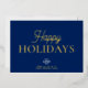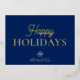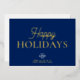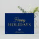 Envíe elegantes saludos de vacaciones a clientes, empleados y socios de negocios con esta sofisticada y sencilla tarjeta corporativa de Happy Holidays. Con un genuino Relieve metalizado dorado "Felices Fiestas" en un fondo azul marino de personalizable, este diseño exuda tanto estilo como profesionalismo. Personalice el logotipo de su personalizado y añada su mensaje de vacaciones en ambos lados. El fondo azul marino se puede cambiar fácilmente para adaptarse a los colores de tu marca, y el Relieve metalizado dorado se puede cambiar a oro rosa o plata para un toque único. Esta tarjeta se configura como una plantilla en línea conveniente, lo que permite una personalización perfecta para crear el mensaje estacional perfecto para su oficina y red profesional.