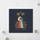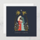 Esta tarjeta de Navidad presenta una ilustración de la sagrada familia enmarcada por un par de palmeras, la estrella de Belén y lirios blancos. Este diseño íntimo captura el milagro y la intimidad del nacimiento de Jesús.