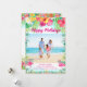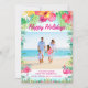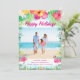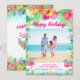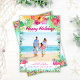 Envía saludos de vacaciones tropicales con esta tarjeta de foto con estilo hawaiano brillante. Características "Felices Fiestas" en tipografía de escritura, su foto costera favorita enmarcada con flores de hibisco de acuarela y hojas de palma y su saludo de vacaciones personalizado. Una divertida tarjeta de vacaciones tropicales traída a usted por Cherry Lane Designs!