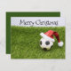 Tarjeta navideña de Navidades de fútbol con sombrero de Santa de fútbol sobre hierba verde.