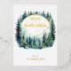 Estas atractivas tarjetas de vacaciones sin foto presentan un marco de círculo de papel de aluminio dorado rodeado de una representación en acuarela de un bosque de pinos invernal sobre un fondo blanco simple. La tipografía elegante de papel de aluminio dorado dice "Deseos de invierno cálido" y la firma en papel de aluminio dorado debajo se puede personalizar según sea necesario.