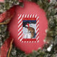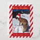 Una tarjeta festiva de vacaciones con papel metálico dorado y un patrón de rayas de bastón de caramelo rojo . También hay un pequeño bastón de caramelo y una pequeña ramita de bayas rojas en la parte inferior derecha e izquierda . Personalízala con la foto favorita de tu perro (o mascota), tu saludo de Navidad y el nombre de tu familia .