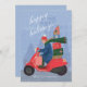 Esta caprichosa tarjeta de vacaciones sin foto presenta una ilustración dibujada a mano de una mujer conduciendo un scooter lleno de regalos y tiene un espacio para incluir una foto familiar y un mensaje en la parte posterior.