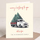 Una tarjeta de Navidad festiva de 5x7 doblada con el título alegre "Merry Christmas to you" en tipografía moderna manuscrita roja, combinada con un gráfico vintage de un camión de entrega de árboles de Navidad. Diseñada sobre un fondo crema vintage, esta elegante tarjeta de felicitación retro combina el encanto nostálgico con un diseño minimalista moderno. Personalice la sección "con amor de" y debajo con el nombre de su familia en tipografía complementaria para un toque cálido y personalizado. Perfecta para compartir amor y deseos navideños, este diseño divertido y clásico no fotográfico añade personalidad a la temporada mientras difunde alegría festiva. Un diseño navideño atemporal ideal para familias, individuos y parejas por igual.