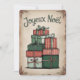 Esta "Joyeux Noël Holiday Card" es un diseño festivo y reconfortante que encarna el espíritu de los Navidades. La carta cuenta con una deliciosa pila de seis regalos, cada uno envuelto en un clásico papel de vacaciones rojo y verde con complicados patrones como rayas, manchas y diseños geométricos. Cada regalo está atado con un codo de cinta que le aporta un toque de elegancia y encanto. La frase "Joyeux Noël" (Francés para "Feliz Navidad") está elegantemente escrita en la parte superior, creando un mensaje cálido y acogedor. El fondo vintage, con texturas sutiles y flores decorativas, realza el ambiente acogedor y atemporal del diseño. Ideal para enviar deseos de corazón a sus seres queridos, esta tarjeta es perfecta para franquear o regalar durante la temporada de Navidades.