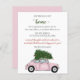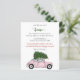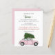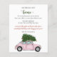 Coche de árbol de Navidad rosa con presupuesto Hemos movido la tarjeta postal de invitación móvil de vacaciones con auto de época roja y árbol de Navidad adornado arriba