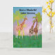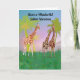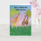 Tarjeta de vacaciones para alguien que va en un Safari animal. El diseño es palmeras ilustradas en bonito, jirafas, flores y hierba sobre un cielo de fondo de bonito. Gracias a los recortes de diseño y a la tela creativa por algunos de los elementos del diseño.