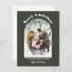 Muestra tu foto favorita con estas tarjetas de vacaciones planas simples y fáciles de personalizar. Su foto vertical o orientada a retratos aparece en una forma de arco atractiva con su titular encima en letras blancas y sus nombres u otro texto personalizado debajo en letras blancas coincidentes. El texto y la foto se colocan sobre un fondo de color verde oliva oscuro.