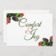Aquí hay un mensaje simple pero elegante para la temporada navideña. Comodidad y alegría. Este mensaje está en una fuente de tipo script. En las esquinas opuestas de las tarjetas hay ramitas de hoja perenne con piñas y bayas. En la parte posterior de la tarjeta hay un cuadro de texto que le permite agregar su propio mensaje de vacaciones. Si lo prefiere, puede eliminar el cuadro y escribir su mensaje.