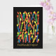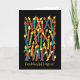 Tarjeta de cumpleaños de colores vivos con velas y "cumpleaños feliz" en galés, de un collage de papel pintado a mano de Judy Adamson. El interior se deja en blanco para tu propio mensaje.