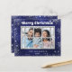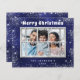 Un fondo azul profundo decorado con purpurinas de plata falsa y estrellas brillantes. El color azul es desigual. Personaliza y agrega tu propia foto, nombre y un año. Con el texto: Feliz Navidad. Una ventana superpuesta sobre tu foto. Añadir el texto al fondo: