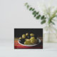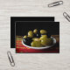 Esta tarjeta de intercambio de artistas presenta una deliciosa variedad de deliciosas aceitunas, incluyendo Picholine, Nicoise, Kalamata, Green Cerignola y Black Cerignola. Están dispuestas en un plato blanco sobre una colorida alfombra roja, amarilla y verde sobre un fondo negro para una composición artística y apasionante de la vida.