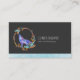 Una tarjeta de visita de estilo boho con un ilustracion gráfico compuesto por un lobo color morado, en una posición de aullamiento clásica. Rodeado por una corona de madera ilustrada, cristales, plumas y perlas. Motif tribal nativo americano de Guay.