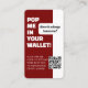 Comparte recuerdos de tu día especial sin esfuerzo y con estilo con nuestra innovadora tarjeta de visita que le permite combinar elegancia clásica con tecnología moderna. El diseño presenta un llamativo texto "Pop Me In Your Wallet" en negrita, que llama la atención mientras los invitados motivadores mantienen la tarjeta a mano. Incluye un prominente código QR que permite a los invitados subir fácilmente sus mejores fotos directamente a un álbum compartido en línea, creando una manera perfecta de reunir tus momentos favoritos.