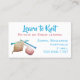 Tarjeta de presentación para un profesor de tejido. "Learn to Knit" es el texto de ejemplo en azul sobre tarjetas blancas. Un par de agujas de punto con una muestra de punto y una bola de hilo es la imagen de la parte delantera con tres plantillas para añadir nombre personal, nombre comercial, ubicación, contacto o lo que sea que necesite. El texto es azul claro y una línea rosada. Un divertido patrón de pelotas de hilados y gatos cubre la parte posterior de las cartas. Este diseño de tarjetas de visita también puede ser utilizado por un diseñador de ropa de cama, un artista de fibra, una tienda de artesanía o un vendedor de hilos. El diseño encajará bien en otros tamaños que tengan una forma similar.