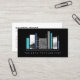 Elegante tarjeta de visita para un arquitecto, en gris, azul, negro y turquesa, con formas geométricas rellenadas con fotos, colores y patrones.
