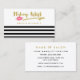 Haz una declaración como artista de maquillaje moderno con estas tarjetas de presentación a rayas blancas y negras de moda con un elegante Relieve metalizado de oro y una glamorosa impresión de lápiz labial rosa de lúpulo. Personalice esta moda y el diseño elegante añadiendo el nombre del cosmetólogo profesional o esteticista certificado.