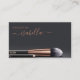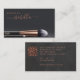 Una tarjeta de visita de un artista de maquillaje minimalista moderno de moda, con una tipografía de escritura de cobre sobre un fondo negro gris carbón, y herramientas de maquillaje de artistas de la profesión sobre un fondo negro. Código QR y medios sociales sobre un fondo afligido de carbón negro en la parte trasera de la tarjeta. Un estilo de moda sencillo.