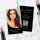 Cree una tarjeta profesional y moderna con una foto personalizado en la parte delantera y detalles personalizados, además de un escaneado código QR en la parte posterior para facilitar el trabajo en red, e iconos editables en los medios sociales. Ajusta fácilmente las fuentes, los colores, el fondo y el diseño para que coincidan perfectamente con el estilo. Ideal para maquilladores, peluqueros, Salón de belleza y negocios que buscan ofrecer una presentación cuidada y profesional.