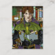 Un joven mago sostiene un viejo libro que tiene un pequeño tierno dragón verde sentado sobre el libro. Detrás hay una biblioteca llena de libros, pociones, calderos, bolas de cristal y plantas
