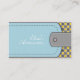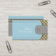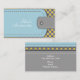 Aspecto de cuero azul y gris y accesorios modernos de patrón amarillo patrón plantilla de tarjeta de negocios con un azul claro y una banda gris con costuras y un botón con estilo de cuero- no cuero real sólo una imagen IMPRESIONADA y un patrón geométrico en gris y amarillo.