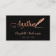 Una elegante tarjeta de visita sobre un fondo negro y una pluma de plumas de oro rosa. Guión elegante de estilo con letras a mano. Personaliza y agrega tu nombre, título, información de contacto y tu propio código QR a tu dirección de sitio web.