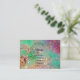 Colorida, elegante y vibrante invitación artística. Bailarines románticos de carnaval: figuras artísticas, caprichosas, expresivas, hermosa mujer rubia con disfraces de gorjones brillantes está bailando con un joven Harlequin con una rosa roja dorada en el trasero de la tarjeta.