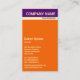 Una plantilla vertical de tarjeta de visita con un encabezado púrpura con una banda crema. Todos los detalles en la parte delantera con la parte posterior en blanco, que se pueden dejar tal como están o seguir personalizando. El diseño también permite añadir muchos elementos, por ejemplo un logotipo.