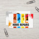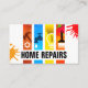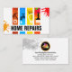 La cubierta incluye cuatro pestañas verticales de colores con herramientas de mano dentro. Las herramientas representan algunos de los servicios que se pueden ofrecer, por ejemplo, el martillo de madera puede representar reparación de carpintería en el hogar, el grifo de burbujas azules para el fontanería, el foco brillante para la electricidad y el pincel de graffiti para la remodelación de la pintura. Debajo de todo esto está el eslogan "HOME REPAIRS" que puedes cambiar. Al dorso, en la cubierta blanca, en la parte superior hay un logotipo dorado "home paint strip fan" que puede utilizar seguido de su prestigioso nombre, detalles de contacto y una opción de slogan para publicitar sus servicios. Una gran tarjeta para el hombre a mano, los contratistas de construcción a usar. Constuctionhandyman, handyman, handyman.