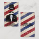 Barbershop tarjeta de visita con bigote , esmoquin, lazo de arco gráfico. La tarjeta tiene una textura gruesa y colores de fondo de barbero tradicionales. Perfecto para peluquería, barbería, peluquería o estilista.