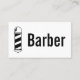 Esta tarjeta de visita tiene un tubo de barbero y la palabra "barbero" en la parte delantera de la tarjeta. La parte posterior de la tarjeta se puede personalizar con el texto deseado, como el nombre del barbero, el nombre de la barbería y la dirección.