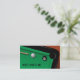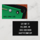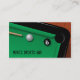 Esta tarjeta de visita ofrece una mesa de billar con una bola de señal blanca, una bola negra ocho, y un palillo de piscina.