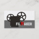 Film maker/director/Movie maker business cards, featuring a black vitage 35 mm movie style camera and the word “FILMAKER” with the M in red in the middle, on white and grey background. The back includes a QR code for more info.