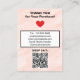 Handmade Jewelry by Name typography in black. Pastel blush pink watercolor wash background. Crafted with Love written in black script (keep or insert short tagline, or delete to leave area blank). Name will appear on front and backside. Two Small Circles against white and black framed background. NOTE: Circles are not pre-cut, you will need to use a Small hole punch to make clean cut holes, to then place your Earrings in. Backside has a red heart element. Insert telephone number, email address, website, social media handle. Insert Your Business Website QR Code for customers to Shop 24/7, or delete as needed. Original Artwork and Design by TamiraZDesigns.