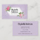 Tarjeta de visita botánica con diseño floral acuarela, texto de personalizable y fondo morado. Las imágenes de flores utilizadas son generosamente dadas por freepik.