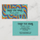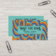 Tarjeta de negocios con líneas onduladas color azul naranja púrpura abstracta estilo de los años 70 con tipografía retro florecida. Un ambiente de los años 60 y 70. Añade tu nombre, compañía y ciudad.
