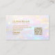Un diseño moderno y elegante de tarjetas de visita con una vibrante paleta de colores iridiscentes de tonos suaves, morados y azules. El diseño se acentúa con un bokeh brillante y un purpurina de oro elegante, creando un efecto atractivo y atractivo. Los detalles claros le dan un toque de brillo y de fantasía, lo que lo hace perfecto para los profesionales creativos, diseñadores de joyas o cualquier persona que busque una moda e identidad de marca memorable.
