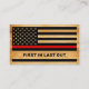 Delgado Red Line American Flag Rustic Firefighter Tarjetas de negocios - Diseño de la bandera estadounidense en colores de la bandera de los bomberos, en un diseño rústico de madera natural. Perfecto para todos los bomberos, bomberos y servicios de bomberos y de bomberos. Personalice estas delgadas tarjetas de visita de línea roja con el nombre, departamento, dirección e información de contacto. Atrás- 'Primero Al Final'. Estas tarjetas de negocios para bomberos son perfectas para todos los bomberos, bomberos, servicio voluntario de bomberos y bomberos, departamentos de bomberos. DERECHOS RESERVADOS © 2020 Judy Burrows, Black Dog Art - Todos los derechos reservados. Tarjeta de presentación de la bandera estadounidense de la línea roja delgada para bomberos rusos