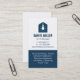 Una tarjeta de visita con una bombilla colgante dentro del logotipo de un icono de la casa. Paleta de colores azul oscuro y blanco. Perfecto para electricistas y aquellos que proveen servicios de instalación de cableado eléctrico y de iluminación. Personalice la información de su empresa en las plantillas de texto fáciles de leer.
