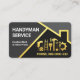 La cubierta incluye un diseño de borde de un edificio de techo de oro creativo. Aquí se encuentra el logotipo de las herramientas de mano de oro que puede utilizar con las herramientas que representan algunos de los servicios que puede ofrecer. Los datos de contacto están justo debajo del logotipo. Arriba está el nombre de la empresa y un eslogan que puede cambiar. Al dorso, en una cubierta gris oscura, el logotipo de las herramientas doradas para el hogar está en la parte superior seguido por el nombre comercial y sus datos de contacto. Una gran tarjeta hecha para los artesanos, los techos y los contratistas de construcción. Construcción, herramientas manuales, techos.