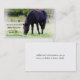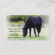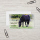 Un caballo negro pasta pacífico en un pasto rural de la granja, con el cercado partido del carril y árboles coloridos en el fondo. La imagen del mismo tamaño cubre la tarjeta con 4 campos delanteros customizeable del texto, y fifth en el revés.