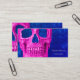Estas tarjetas de visita profesionales de artista de tatuajes presentan una cabeza de cráneo con un diseño creativo de textura azul creativo de neón gótico fucsia rosa rosa azul real. Guay, único, aterrador, moderno y de moda. Derechos de imagen de Marg Seregelyi Photography.