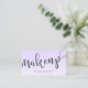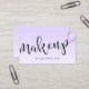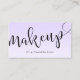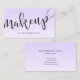 Elegante diseño minimalista de tarjetas de visita de maquillaje que incluye su nombre y texto de maquillaje en una escritura manuscrita moderna, fondo de color de lavanda degradado e información de contacto en el reverso.