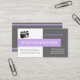 Tarjeta de presentación para fotógrafos grises, blancos, lavender que atraen la atención de los ojos y que incluye una cámara para fotógrafos de color negro sobre fondo gris y una banda de lavanda morada con el texto Fotógrafo. Una gran tarjeta profesional de negocios para la fotógrafa o el negocio de la fotografía y los servicios.