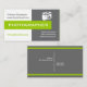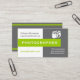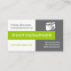 Tarjeta de presentación para fotógrafos grises, blancos, verdes que captan los ojos y que incluye una cámara para fotógrafos de color blanco sobre fondo gris y blanco y una banda verde lima con el texto Fotógrafo. Una gran tarjeta profesional para el negocio de la fotografía y los servicios.