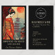 Tarjeta de visita con un elegante y hermoso maiko / geisha, templos pagoda y un gran sol rojo - todos viejos símbolos de Japón. El texto puede ser personalizado o borrado. Perfecto para negocios japoneses, teatros o restaurantes.