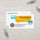 Una creativa caja amarilla de discursos con comas invertidos aloja tu prestigioso nombre y título de trabajo con una leyenda de eslogan cerca de la base de la caja. Hacia la base de la tarjeta se encuentra un logotipo global dorado que se puede utilizar con el nombre de la empresa y los datos de contacto a su lado.